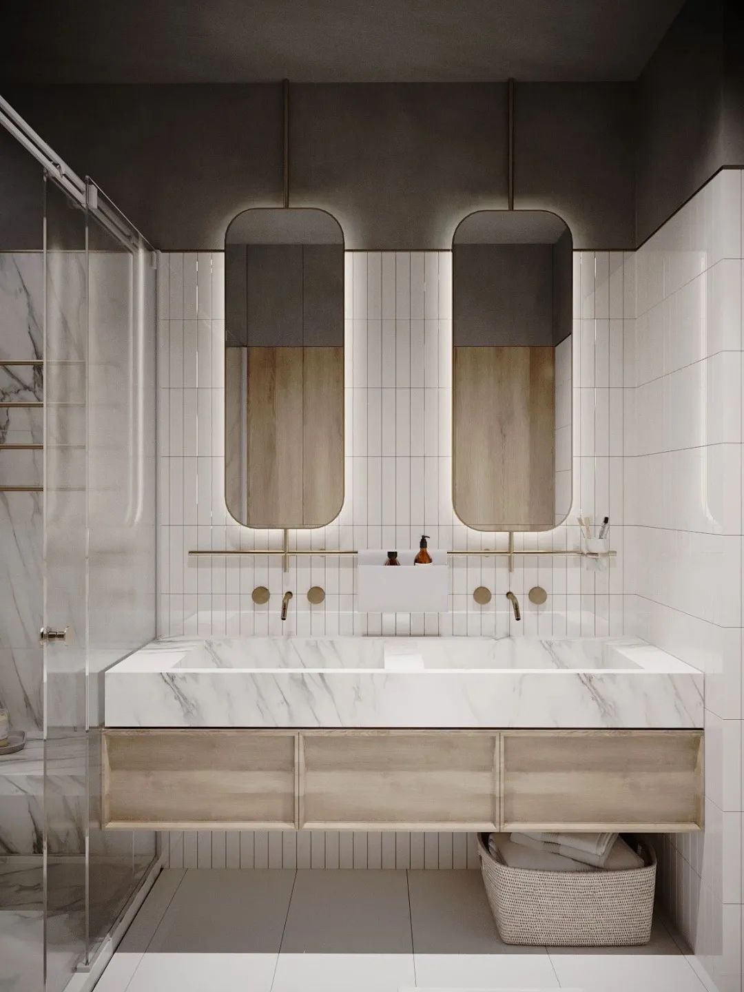 设计师选用白色与木色作为空间的主色调,营造柔和的空间氛围。白色大理石洗手台赋予空间轻奢气息,对称式的双台盆设计,美观大方。