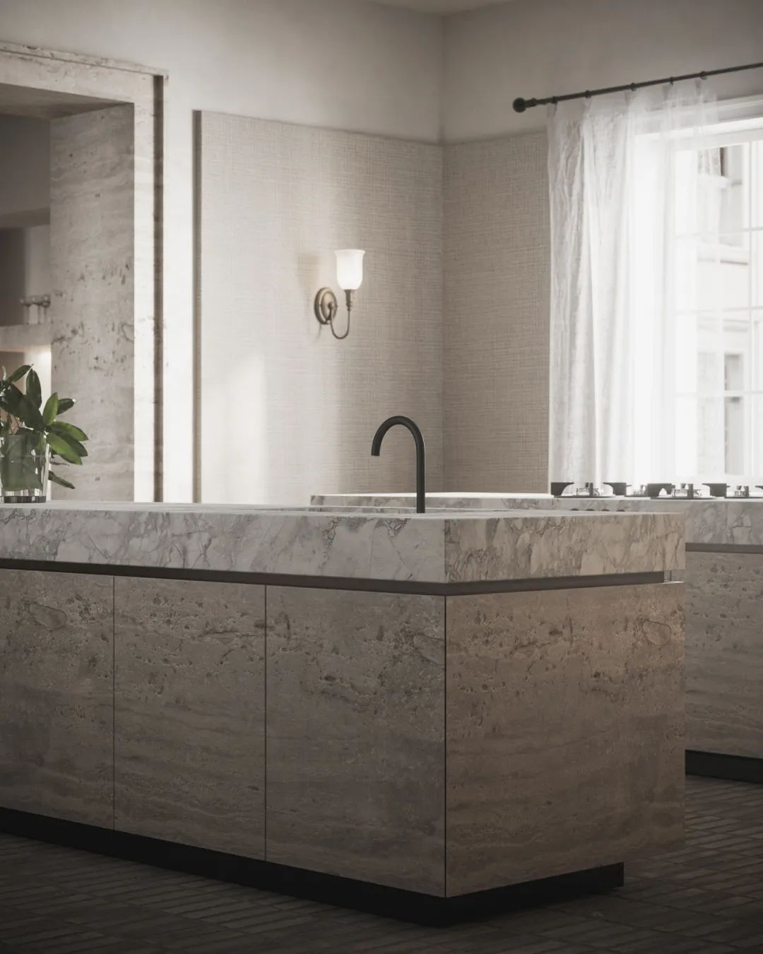 厨房中,对称式的设计奠定了整体空间沉稳的基调,大面的窗户保证了室内拥有充足的光线,给人明亮的视觉感受。中岛台选用天然石材,细腻的纹理提升了空间的整体质感。厨房电器镶嵌于橱柜之中,兼具美观性与实用性。餐桌餐椅同样选用天然石材,与整体空间相呼应。