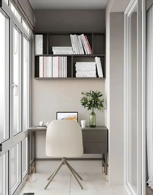 阳台被设计成内包式,设计师将它们整体规划成办公区域和休息空间,罗马百叶窗的设计让阳光尽情地涌入室内。