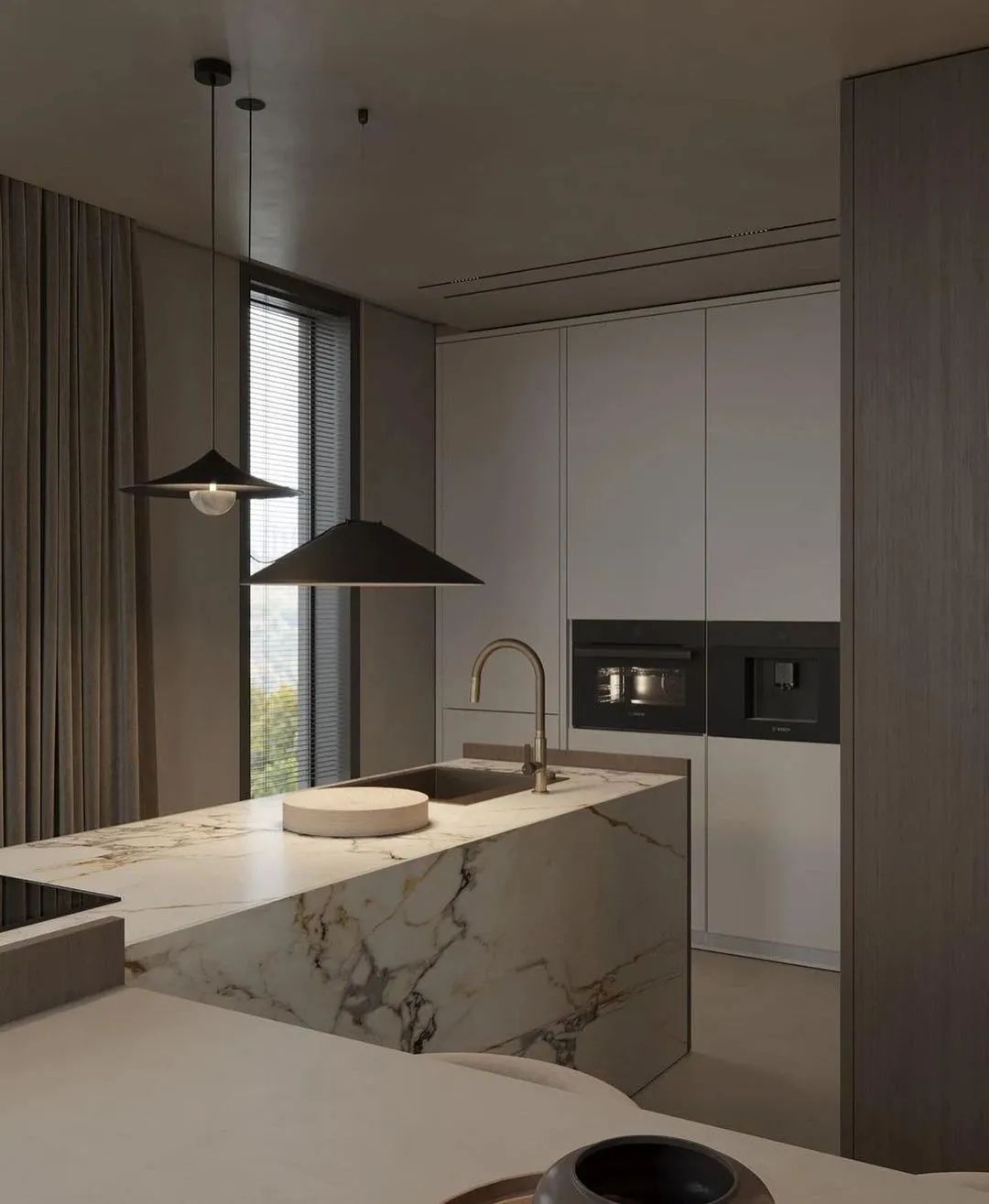 餐厅和厨房位于同一空间。白色大理石材质的中岛台与餐桌相连接,简洁的造型为屋主营造出了一个高级大气的用餐空间。落地窗的存在让屋主在用餐时还能欣赏到窗外的风景,厨房电器镶嵌与橱柜之中,兼具美观性与实用性。