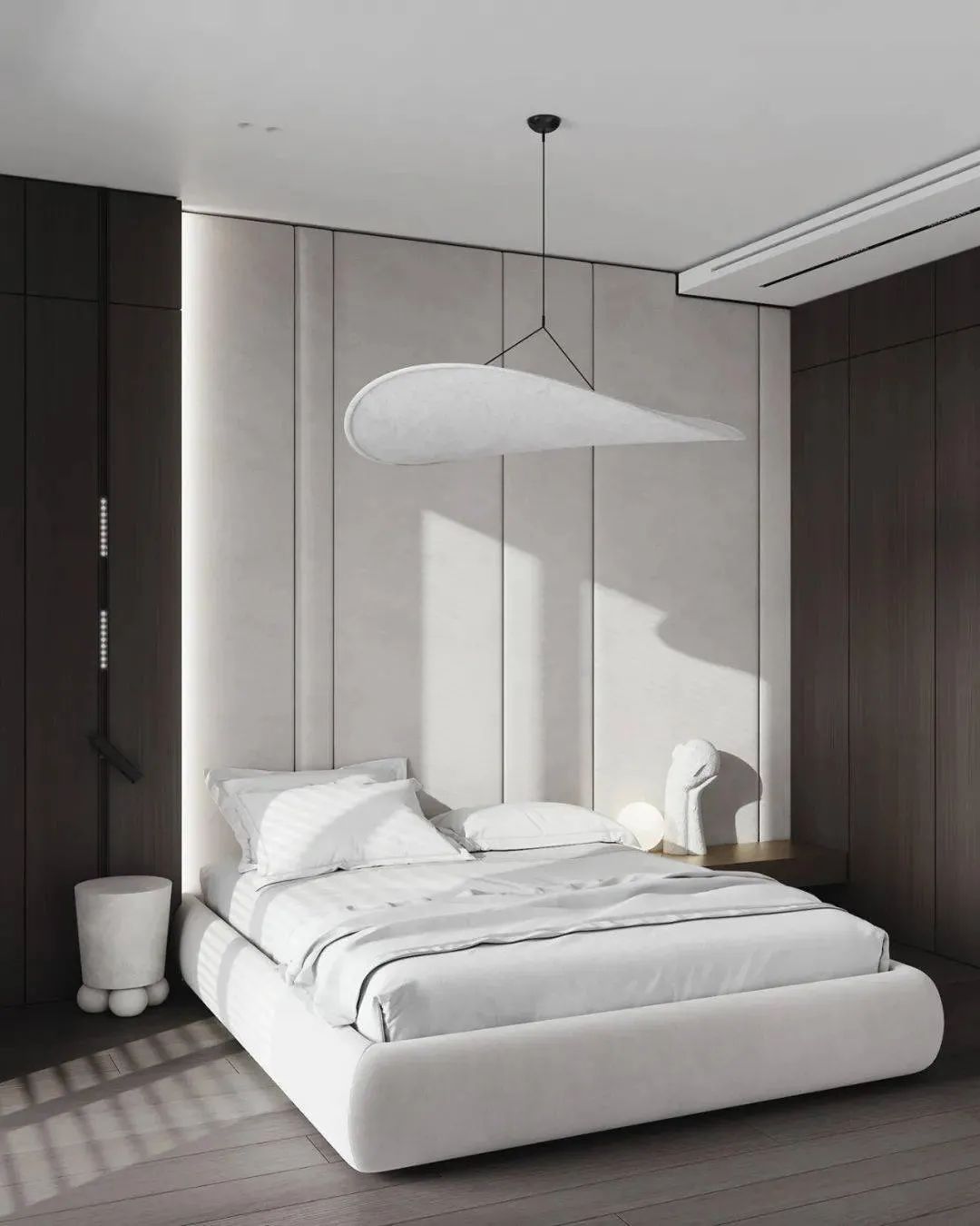 卧室以黑色和白色为主,黑胡桃色的柜体和地板搭配白色的墙面和双人床,营造出了明显的对比,整个空间色彩分明,黑白色的碰撞营造出了别样的美感。