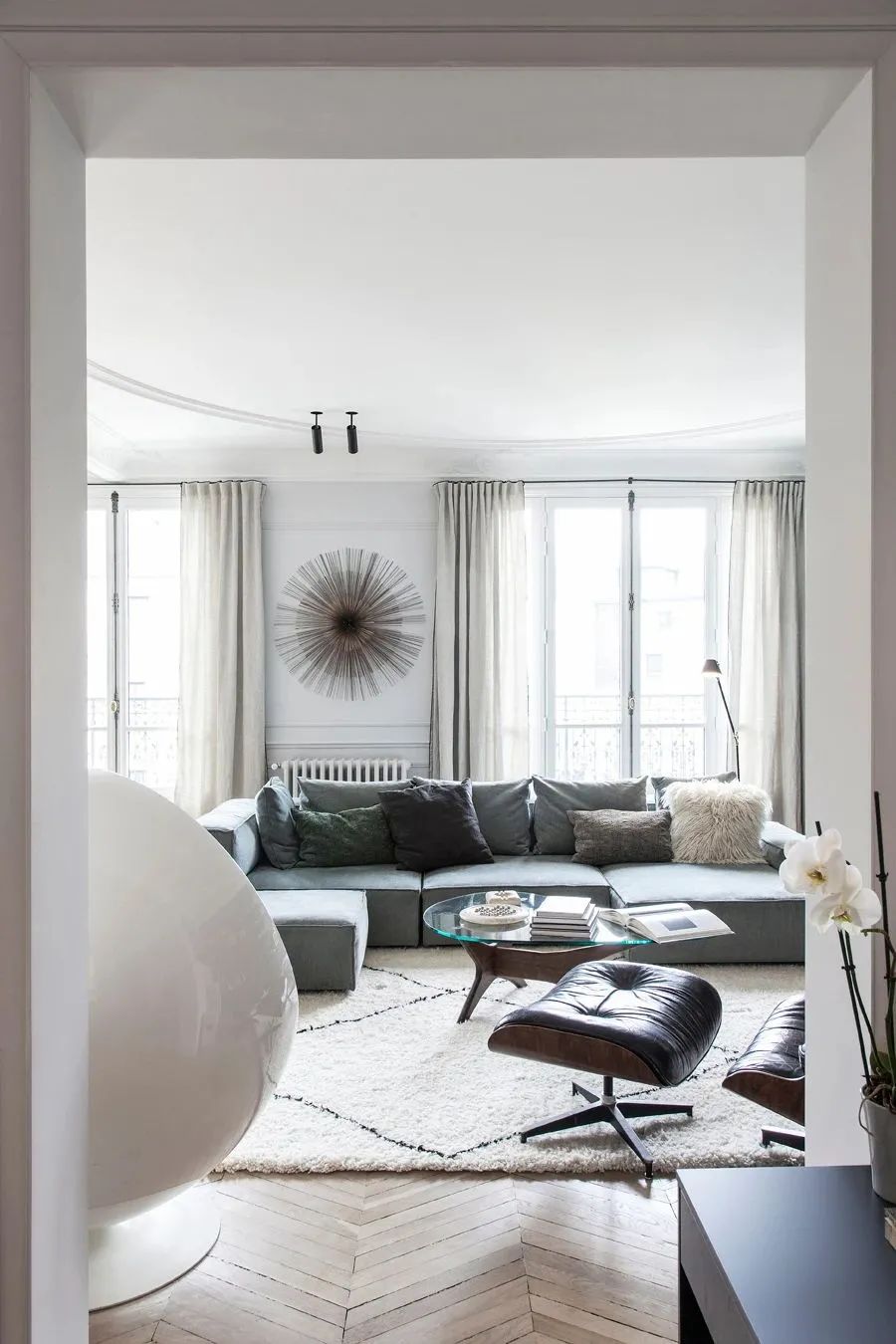 进入客厅后,便是另外一种心情,视野更加开阔,深海蓝的主色调让客厅更加稳重洒脱,绒布的材质带来了柔和色线条感,也让这里更加温馨舒适。吊灯由一个个小巧的球型组成,美观的同时,减少了空间的繁琐感。