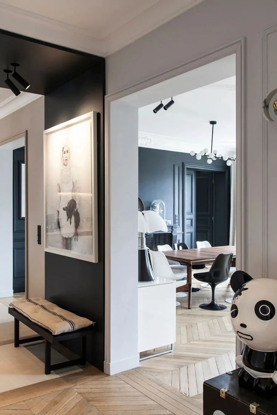 轻薄的木纹餐桌毫无负重感,搭配黑白相间的座椅,增加了这里的趣味性以及层次感。于深海蓝的墙壁而言,更加轻松自在。