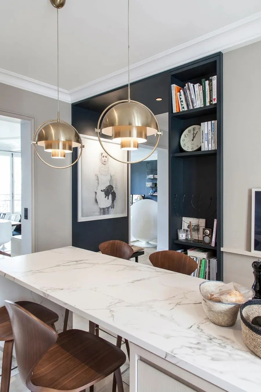 厨房与餐厅处于半开放式的空间,视野上更加开阔。天花板的浮雕纹理彰显优雅精致的情调。厨房金属吊灯为空间添砖加瓦,金属的光泽在大理石的衬托下,更加通透、明亮。