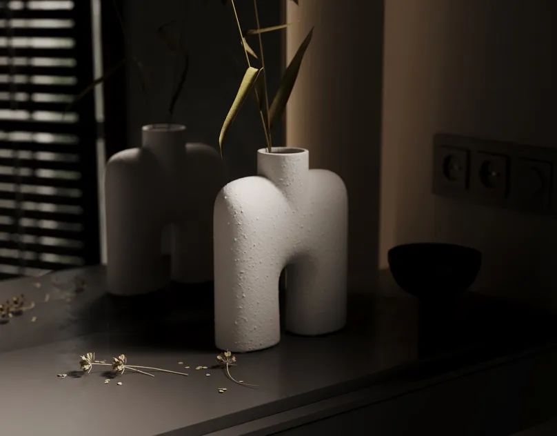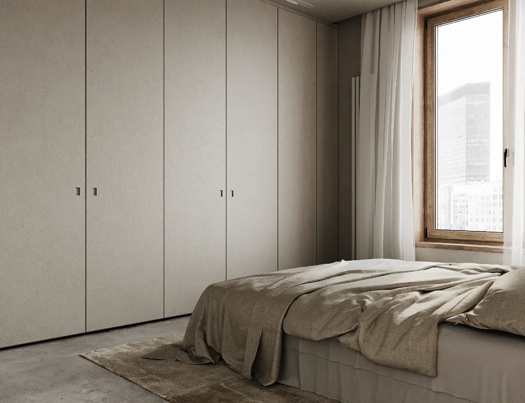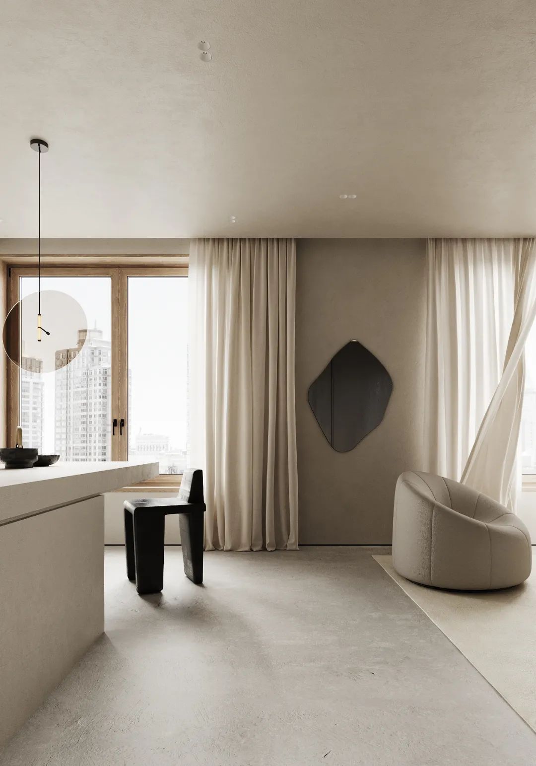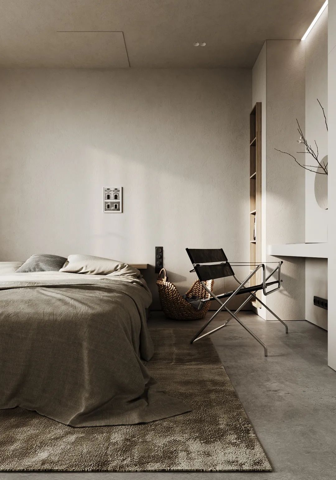 卧室运用极简主义的设计手法,利用微水泥创造了一个充满艺术格调的空间,材质和色彩均与空间整体相呼应,从配饰的细节上来看,设计师更偏于古典和独特的风格。