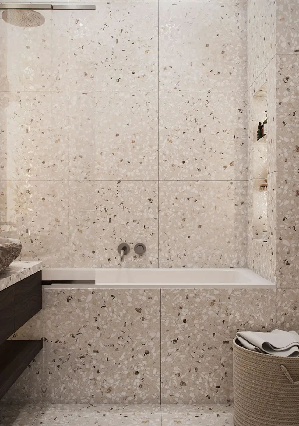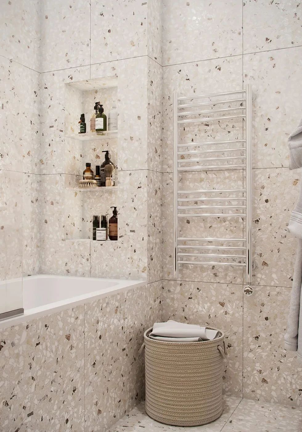 浴室利用水磨石作为铺垫,大理石搭建的洗漱台看起来大气有格调。利用干草植物和藤编织物的收纳筐用来点缀室内,显得整体既清新又治愈。