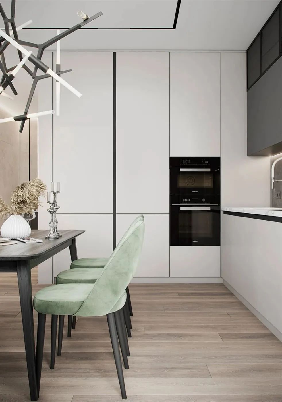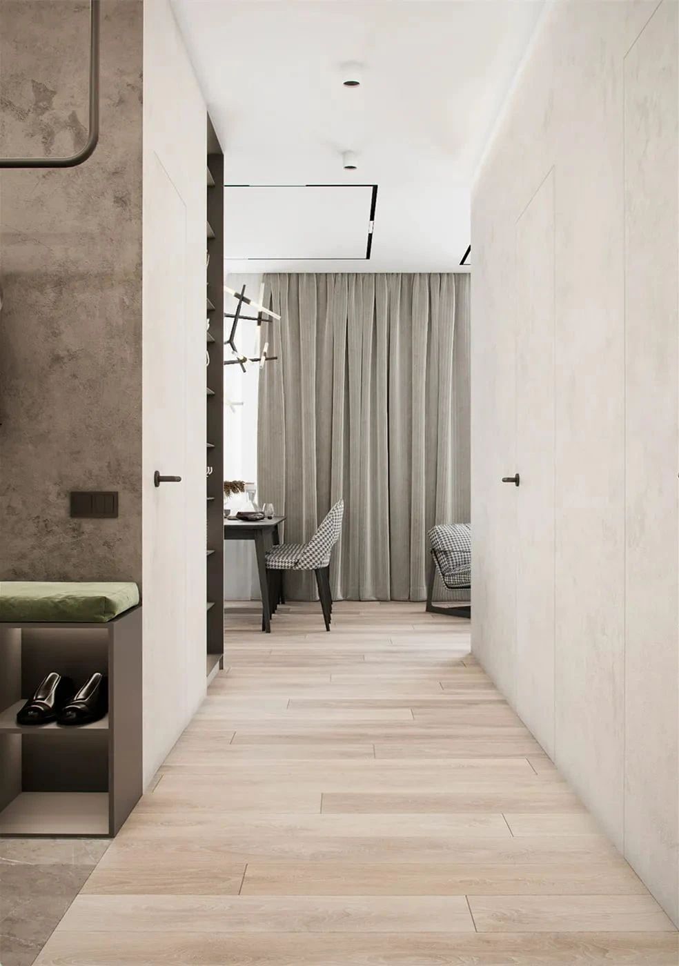 浅色的木质地板与复古绿的软饰相对比,交织成一片柔和温润的宁静空间。