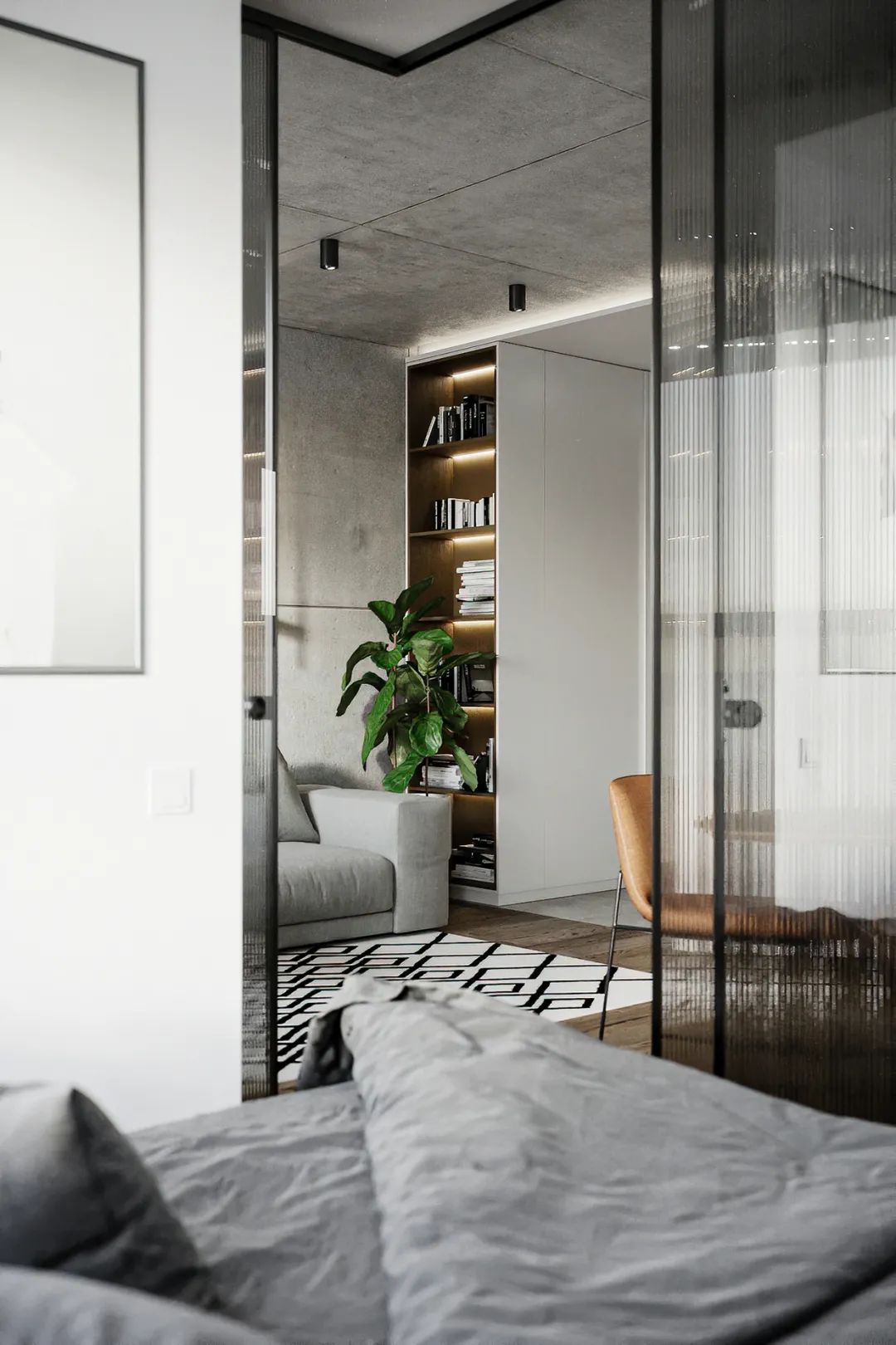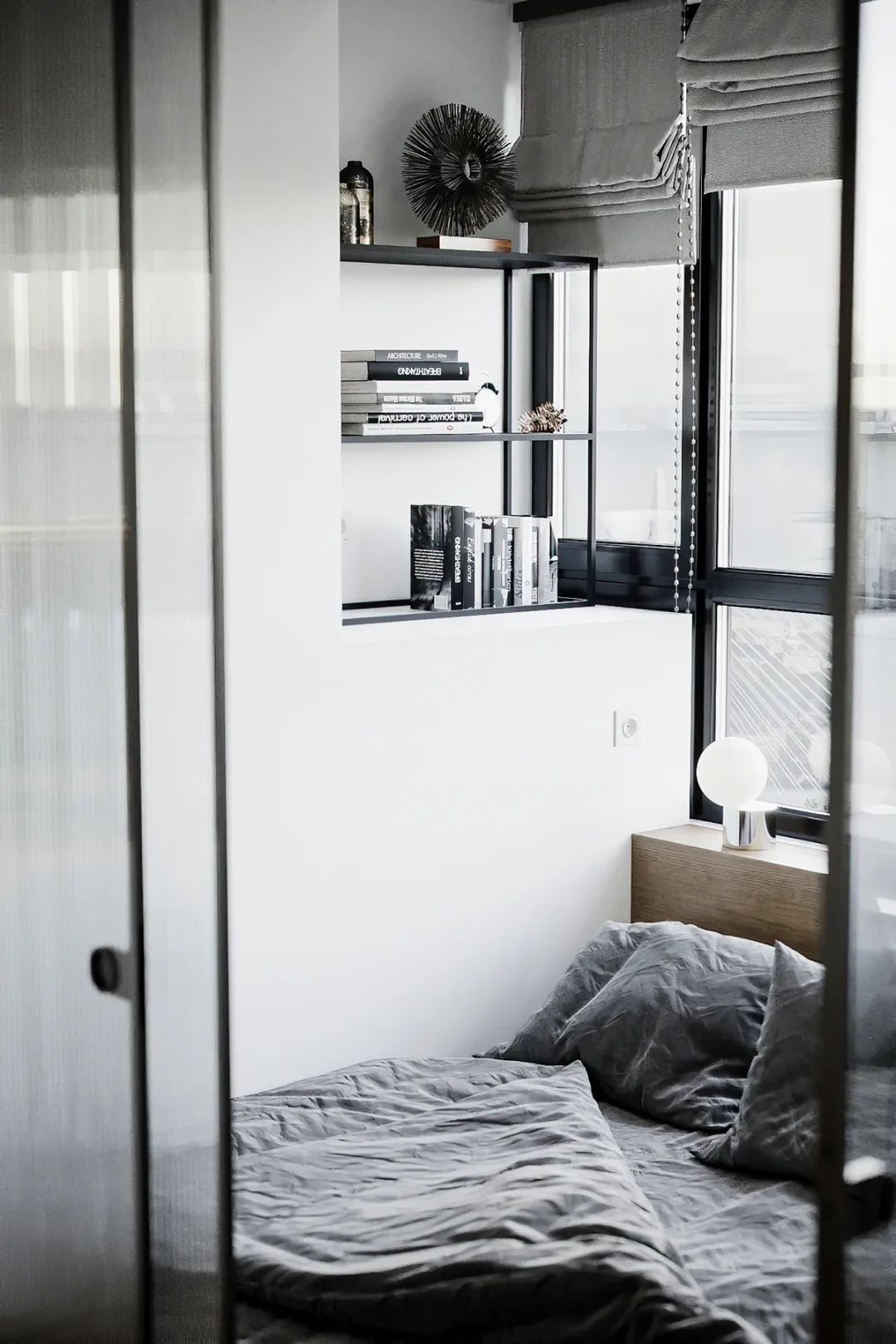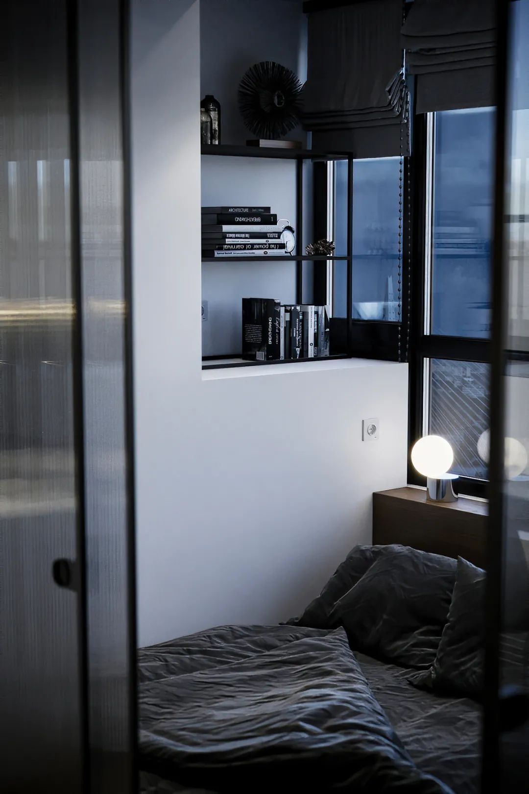 卧室被安排在了厨房和休闲区的间隙,由于空间有限,设计师利用玻璃进行隔断,既保证了光线的充足,同时也确保了私密性。