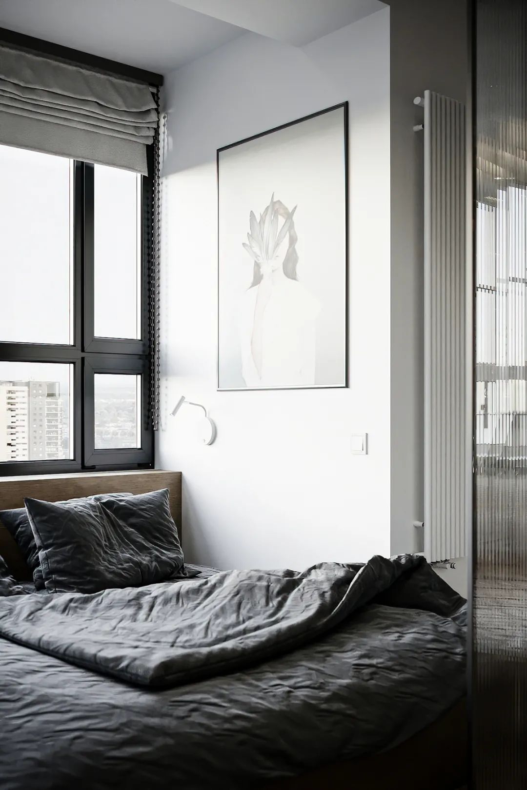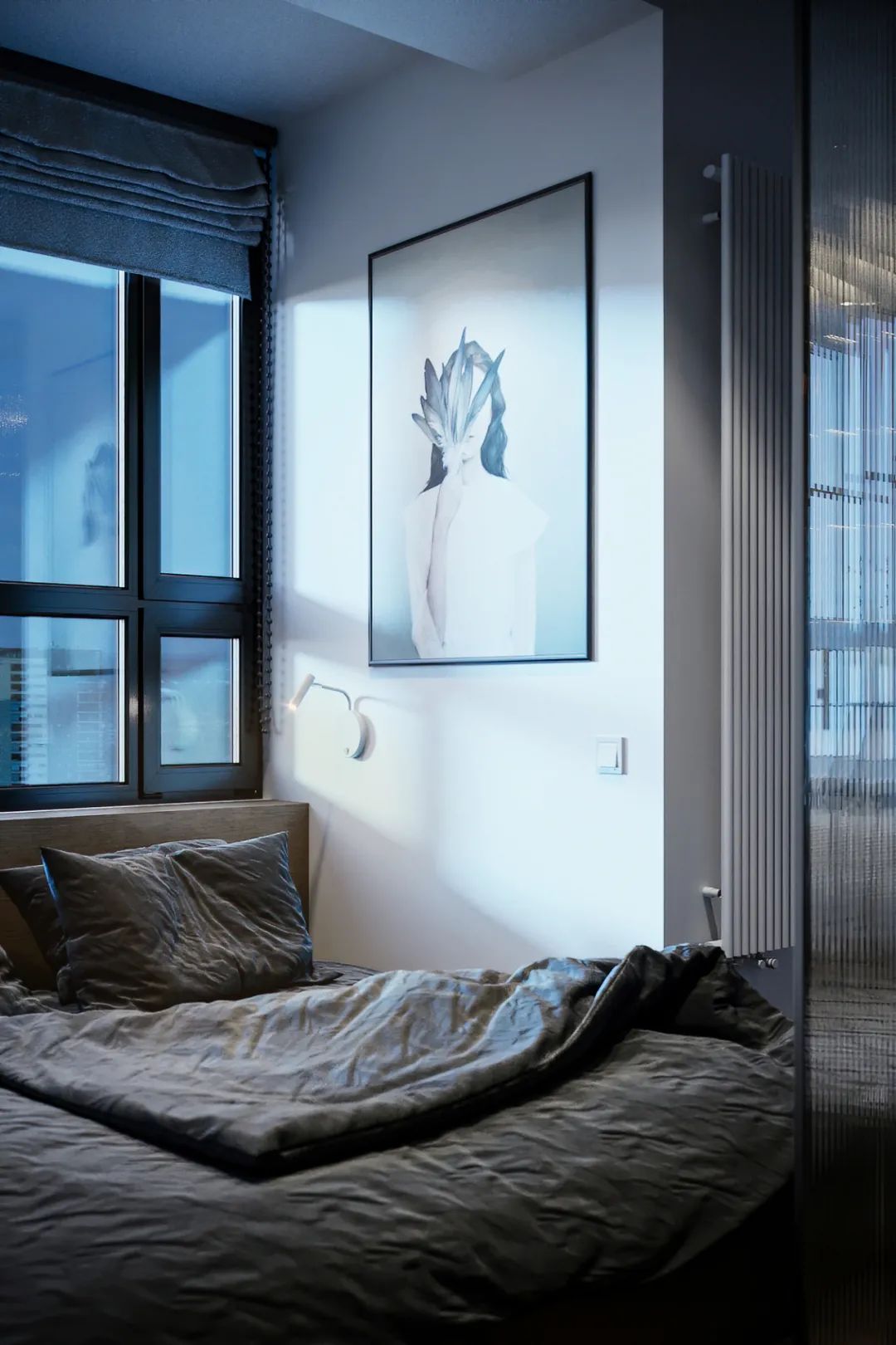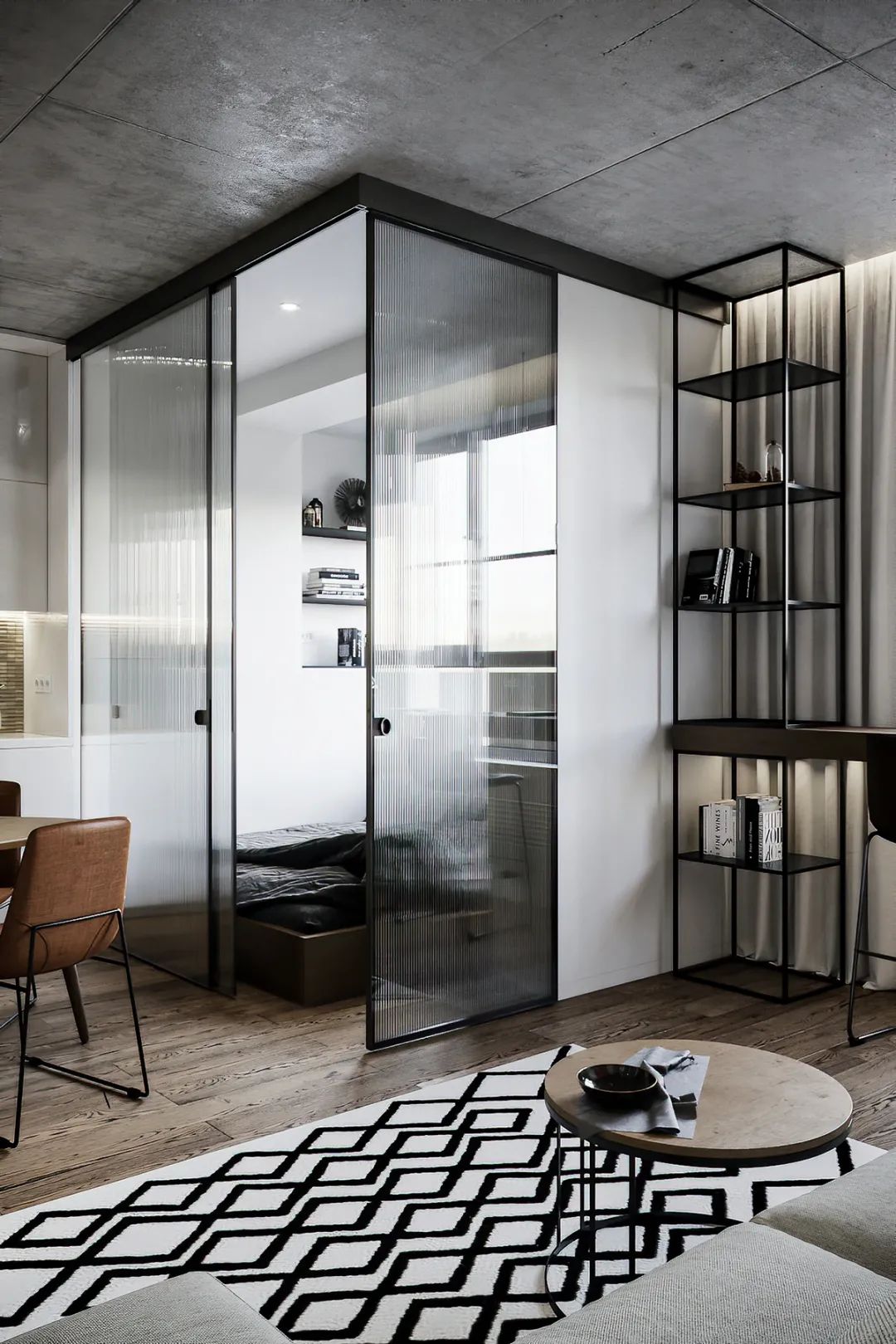 卧室被安排在了厨房和休闲区的间隙,由于空间有限,设计师利用玻璃进行隔断,既保证了光线的充足,同时也确保了私密性。