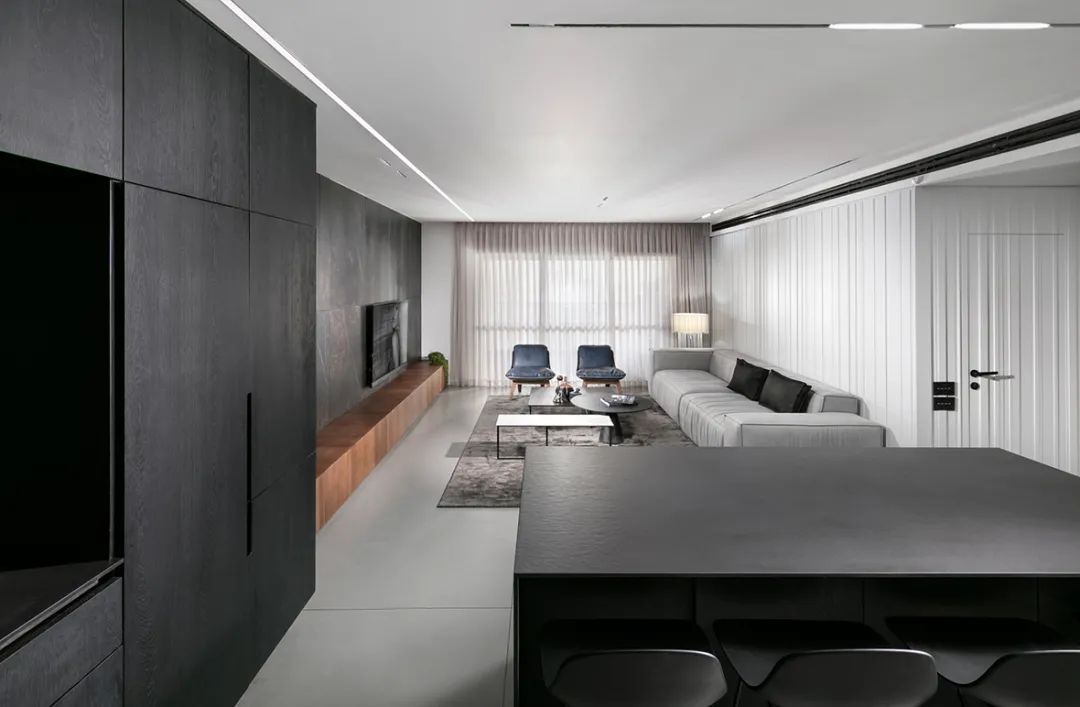客厅与厨房位于同一空间,开放式的设计让公共空间的面积更大。客厅中大面的落地窗为室内带来了充足的光照,也增加了空间的通透性。哑光黑色的电视墙,提升了空间整体的质感。