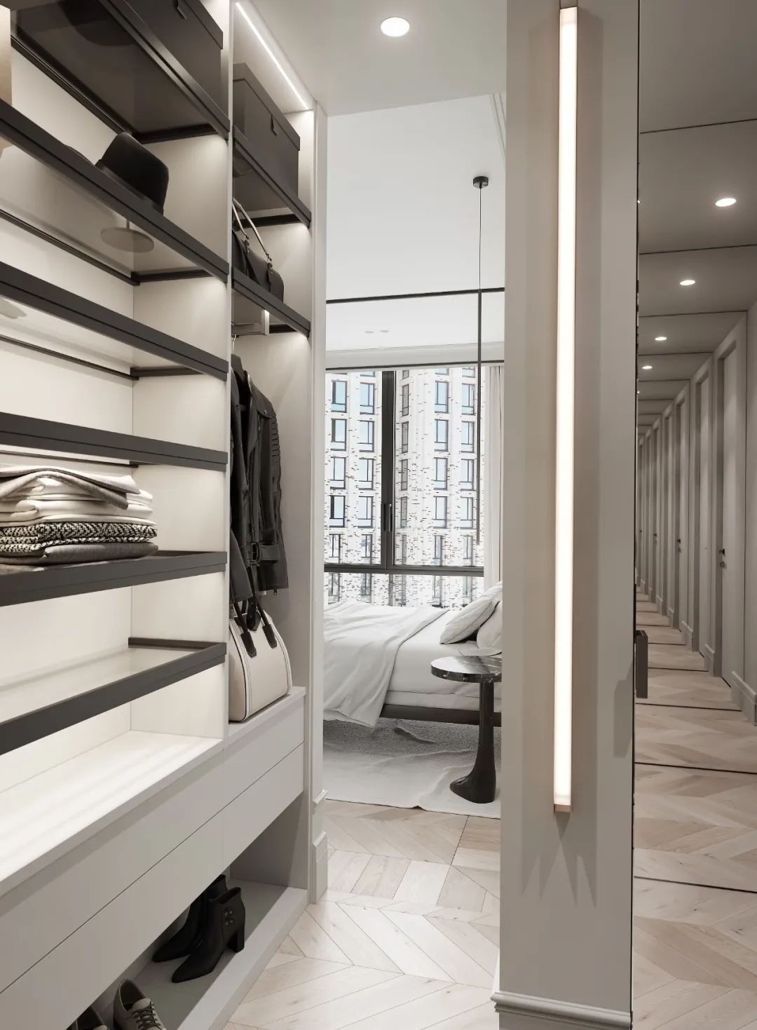 衣帽间同样沿用了木质地板与白色搭配的设计,巨大的落地镜反射出卧室走廊,显得空间更是大了许多。