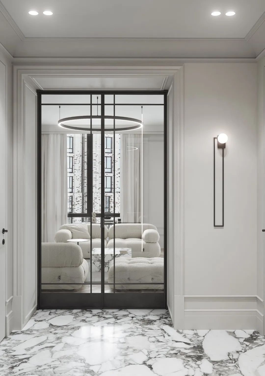设计师在内部设计中采用了方形,同时采用了餐盘形状的吊灯,让整个客厅显得柔和简洁。客厅和用餐区以及厨房就证据了整个公寓的一半。